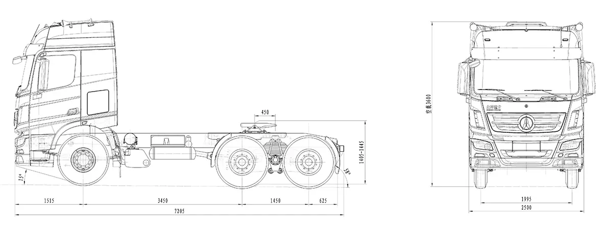 Dimensions | Empattement (WB) : 3450 + 1450 mm Longueur totale (OL) : 7100 mm Largeur totale (OW) : 2550 mm Hauteur totale (OH) : 3380 mm Porte-à-faux avant (FOH) : 1515 mm Porte-à-faux arrière (ROH) : 625 mm Rayon de raccordement avant pour semi-remorque : 2500 mm Rayon de raccordement arrière pour semi-remorque : 2300 mm | Empattement (WB) : 3450 + 1450 mm Longueur totale (OL) : 7100 mm Largeur totale (OW) : 2550 mm Hauteur totale (OH) : 3380 mm Porte-à-faux avant (FOH) : 1515 mm Porte-à-faux arrière (ROH) : 625 mm Rayon de raccordement avant pour semi-remorque : 2500 mm Rayon de raccordement arrière pour semi-remorque : 2300 mm | Empattement (WB) : 3300 + 1350 mm Longueur totale (OL) : 7210 mm Largeur totale (OW) : 2550 mm Hauteur totale (OH) : 3950 mm Porte-à-faux avant (FOH) : 1515 mm Porte-à-faux arrière (ROH) : 1035 mm Rayon de raccordement avant pour semi-remorque : 2600 mm Rayon de raccordement arrière pour semi-remorque : 2190 mm |