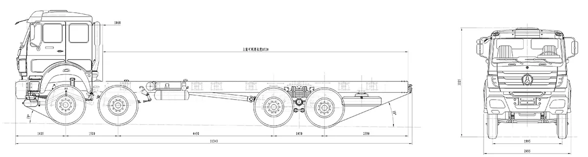 Dimensions | Empattement (WB) : 1500+4450+1450 mm Longueur totale (OL) : 11 500 mm Largeur totale (OW) : 2 500 mm Hauteur totale (OH) : 3 670 mm Porte-à-faux avant (FOH) : 1 435 mm Porte-à-faux arrière (ROH) : 2 300 mm |