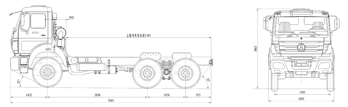 Dimensions | Empattement (WB) : 3800+1450 mm Longueur hors tout (OL) : 8000 mm Largeur hors tout (OW) : 2700 mm Hauteur hors tout (OH) : 3670 mm Porte-à-faux avant (FOH) : 1435 mm Porte-à-faux arrière (ROH) : 1600 mm |